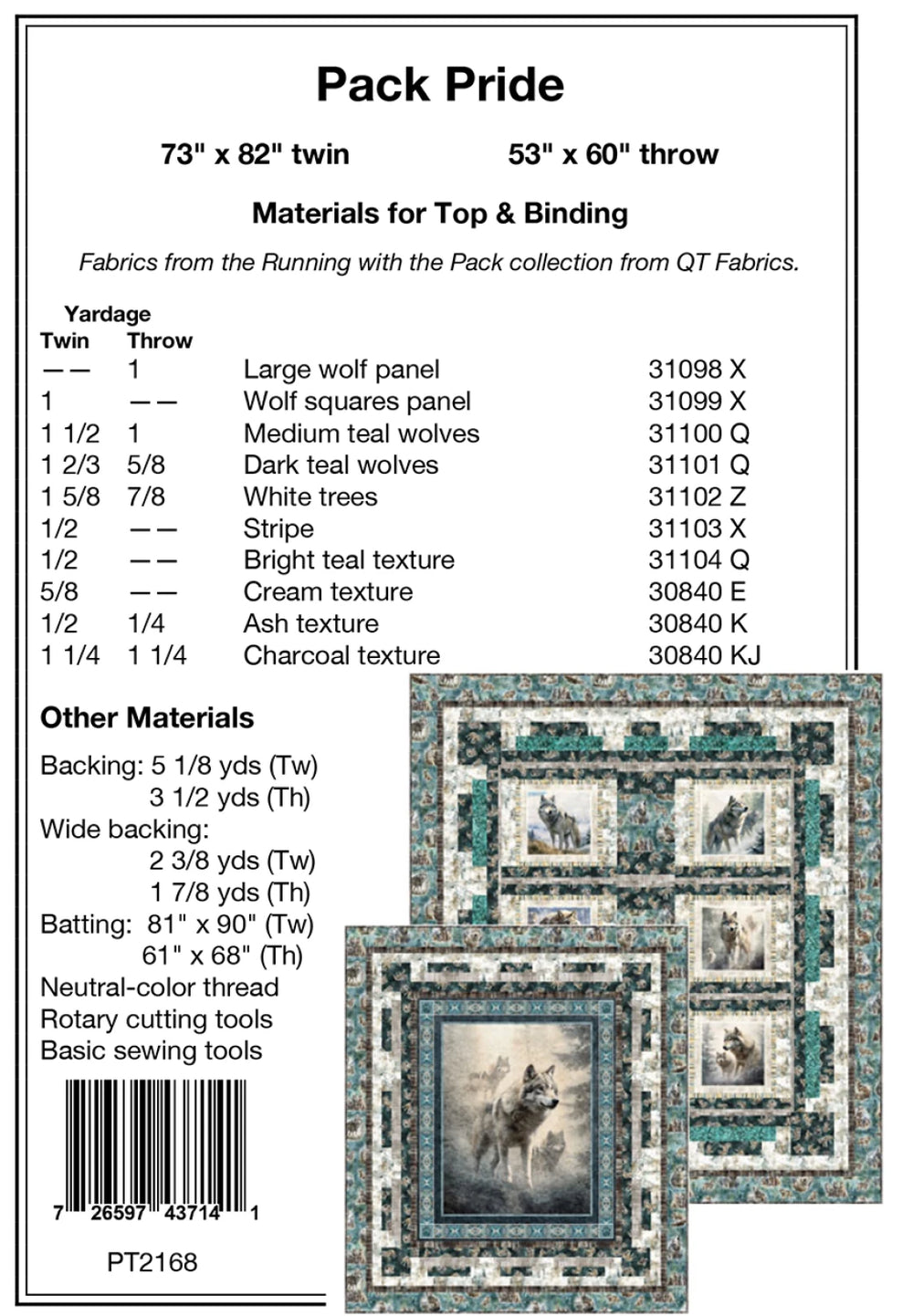 73" x 82" twin and 53" x 60" throw.