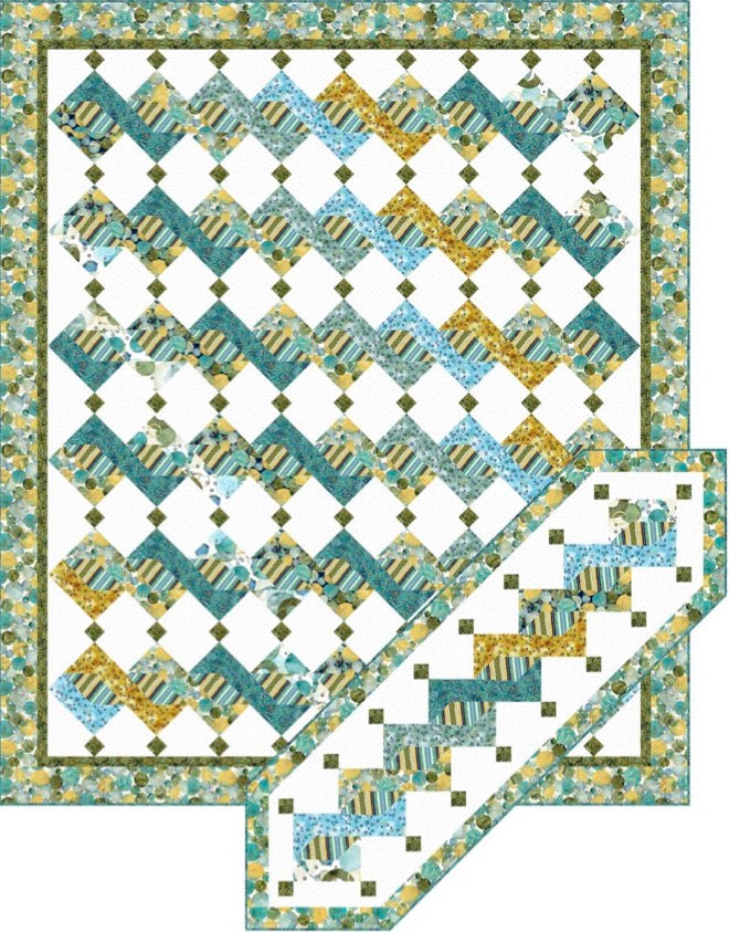 66″ x 77″ throw and 19″ x 63-1/2″ runner. Flying geese, double-angled and square-in-a-square units made with quick-corner triangles make the blocks and sashing for these projects. Fabrics shown from the Mediterranea collection by QT Fabrics. Skill Level: Intermediate.