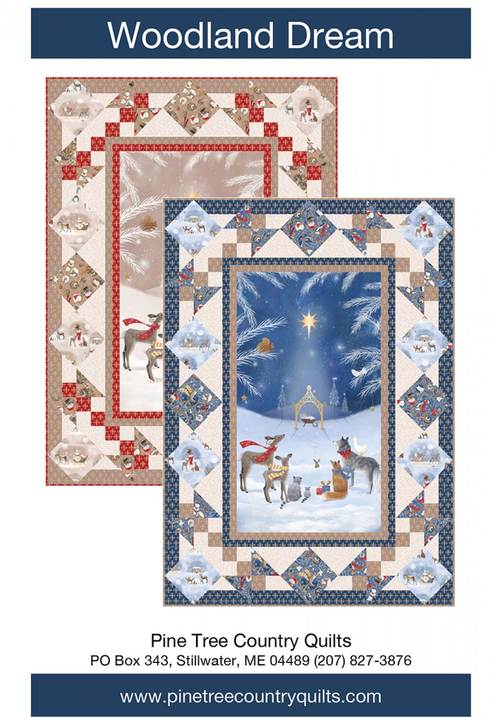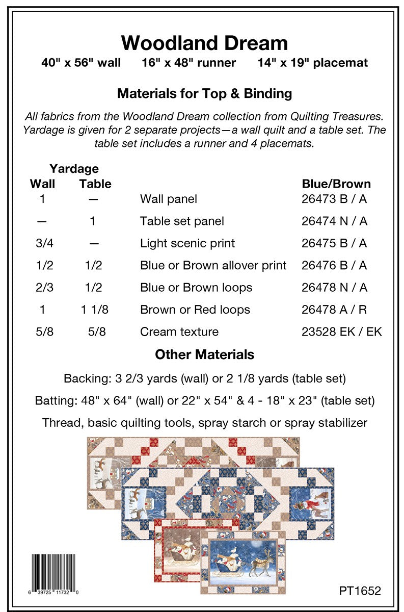 Includes a 40in x 46in wall quilt using a 2/3 yard holiday panel and a table set of 16in x 48in runner and four 14in x 19in place mats that use a placemat/coaster panel. Samples feature the Woodland Dream fabric collection from Quilting Treasures.