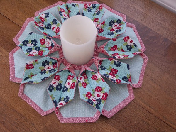 Fold'n Stitch Blooms are candle mats with a 3-D twist! Feature a small floral and watch it pop. A votive candle fits nicely in the center of this mat, as well as a LED pillar. Let your fabric bloom! Finished Size 14in diameter.