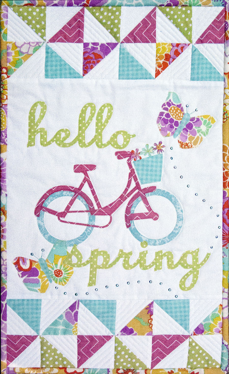 Celebrate Spring's arrival with this 12" x 20" banner! Features half square triangles, fusible applique and iron-on rhinestuds.