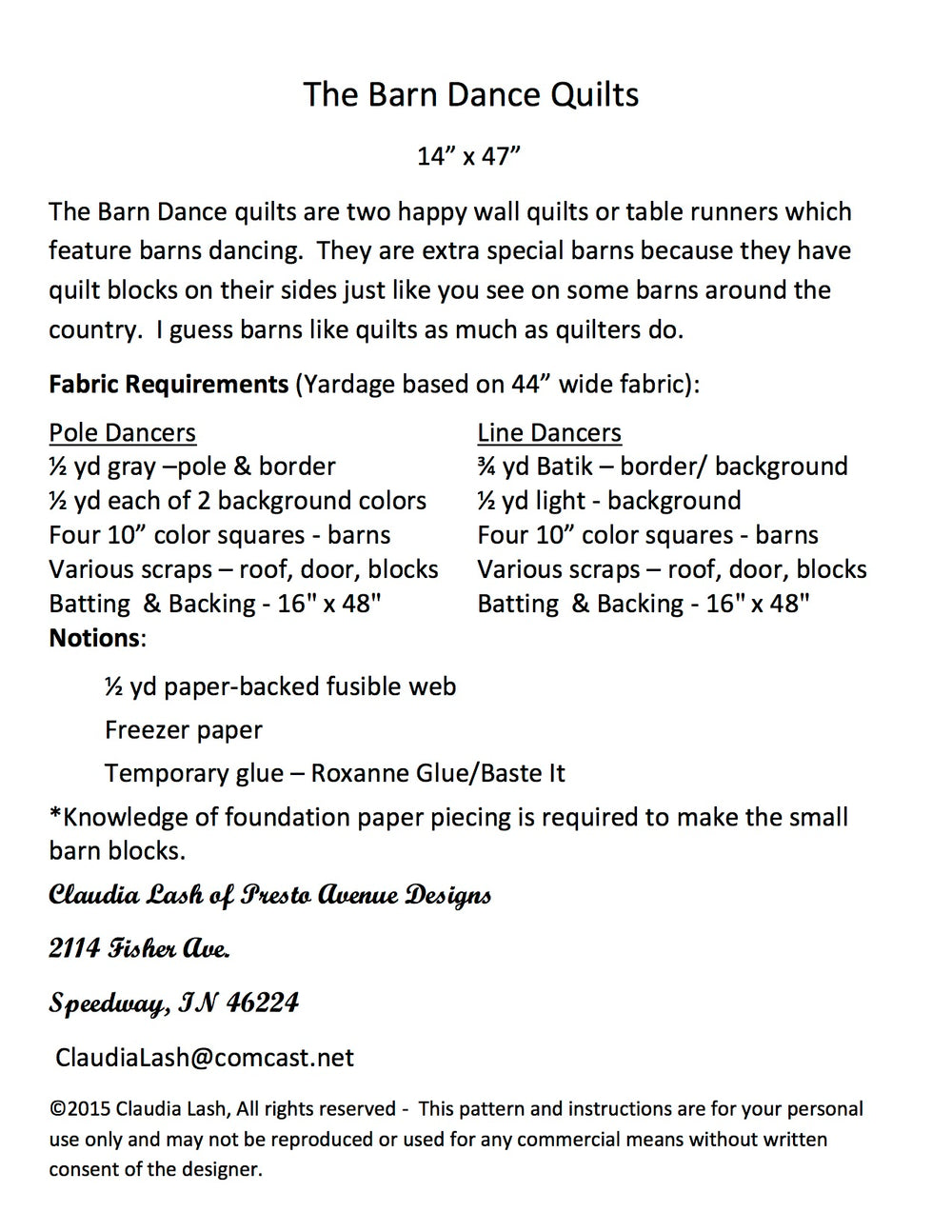 Do you enjoy seeing quilt blocks on the sides of barns? I do, and I have wanted to make a barn quilt for quite a while. As I was designing this quilt, I wanted a quilt block on the barn, and I wanted a happy quilt. The barns in these quilts are so happy that they’re dancing. You can choose to make The Pole Dancers quilt or The Line Dancers quilt or both. In fact you may find that making the barns is so much fun that you make enough barns for a bed-size quilt. The barn is made using fusible appliqué with a 3"square area left open for a quilt block to be placed underneath. I have included some choices of simple 3” quilt blocks but feel free to find or draw more. It is best to make the barns first and then make the 3" blocks to coordinate. Skill level: Intermediate