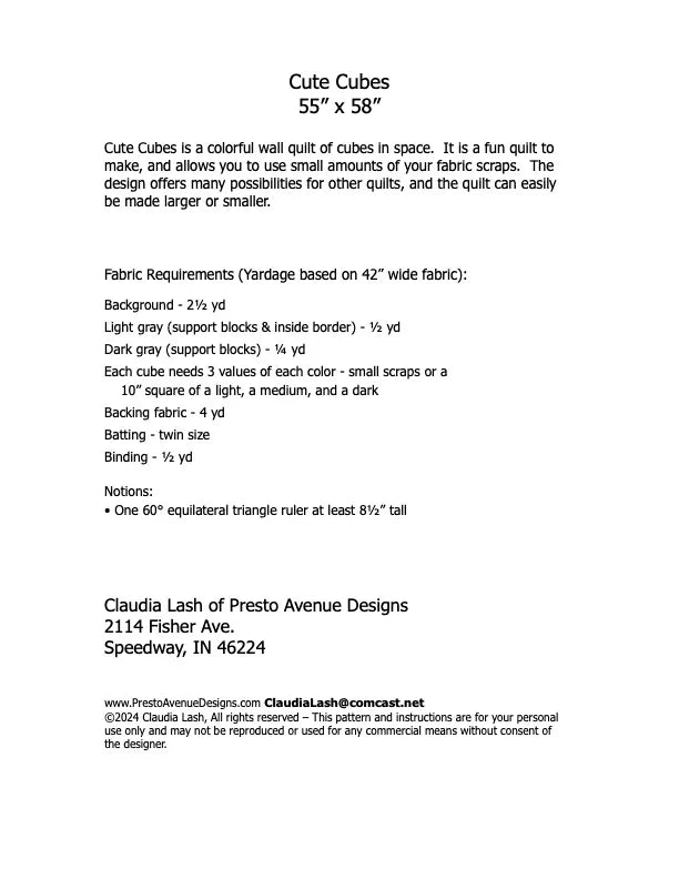 Cute Cubes is a colorful wall quilt of cubes in space.  It is a fun quilt to make, and allows you to use small amounts of your fabric scraps.  The design offers many possibilities for other quilts, and the quilt can easily be made larger or smaller.