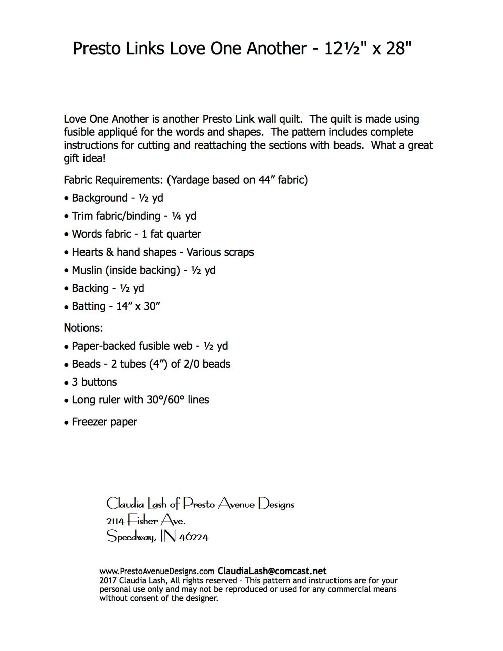 Love One Another is another Presto Link wall quilt. The quilt is made using fusible applique` for the words and shapes. The pattern includes complete instructions for cutting and reattaching the sections with beads - a great gift idea!..