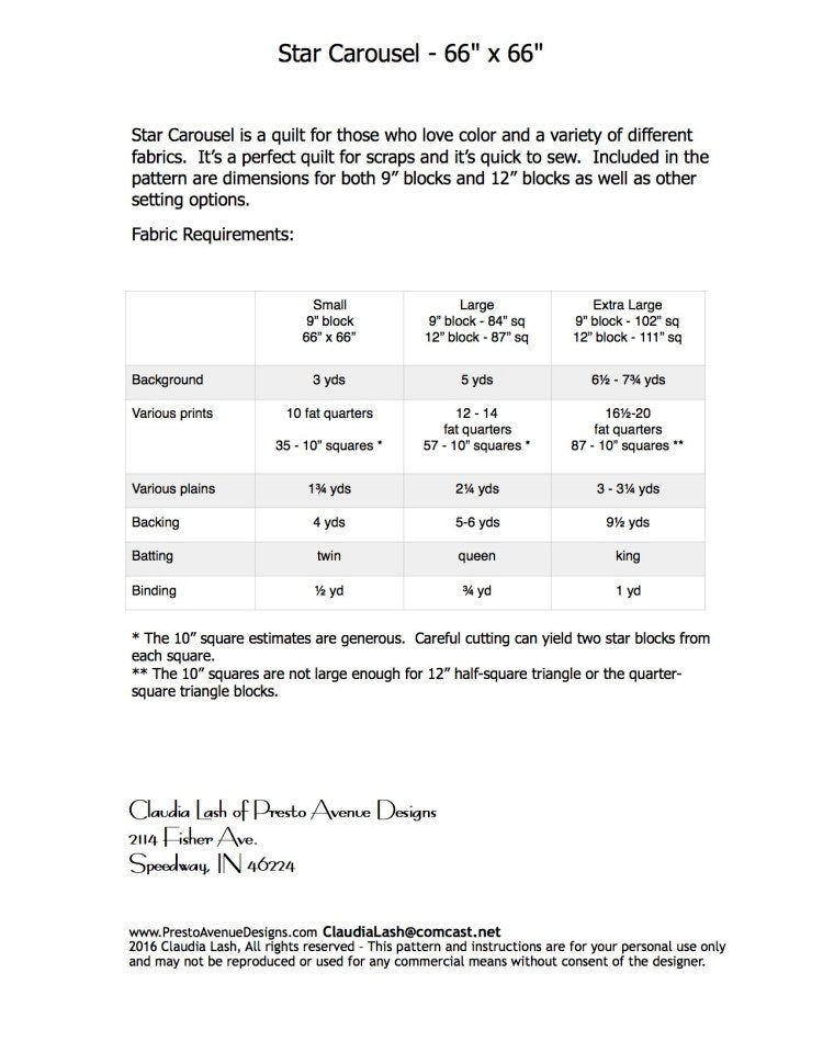 Star Carousel is a quilt for those who love color and a variiety of different fabrics. It's a perfect quilt for scraps and it's quick to sew. Included in the pattern are dimensions for both 9" blocks and 12" blocks as well as other setting options.