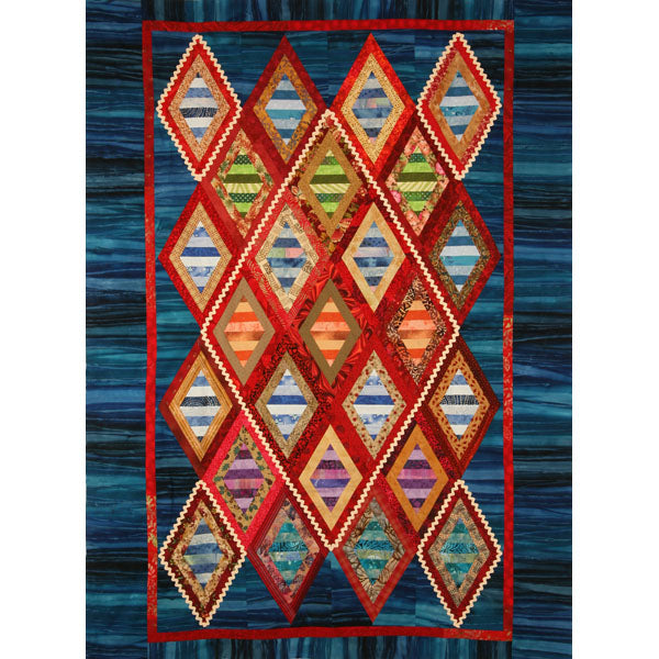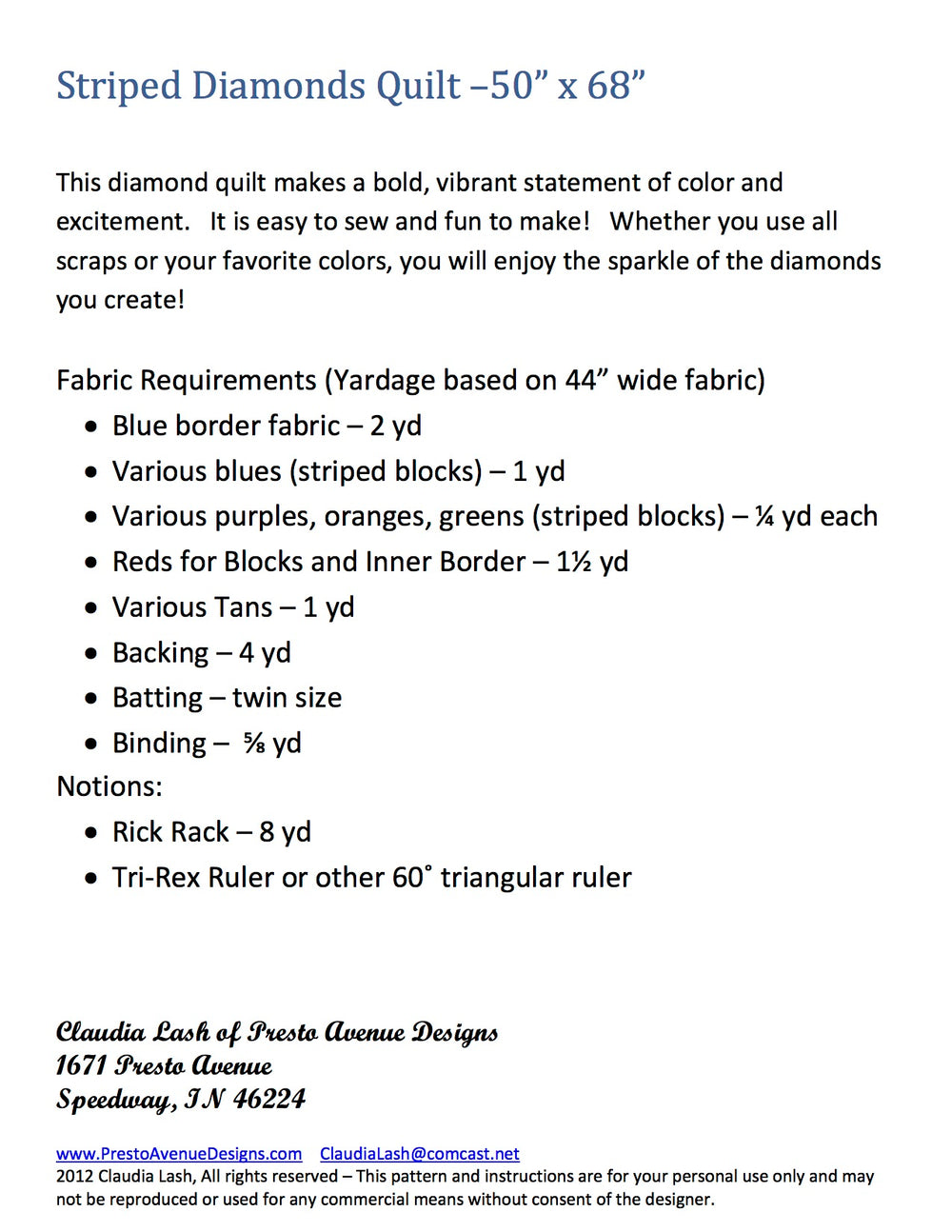 This quilt is actually my second diamond quilt with stripes. The first one I made had very large 45 ̊ diamonds. I liked the idea, but the diamonds became too large and the construction became a chore. So this diamond quilt is made using a 60 ̊ angle ruler and smaller diamonds. It is a good scrap quilt, and is not difficult to piece. This one would be easy to enlarge just by making a few more diamond blocks.