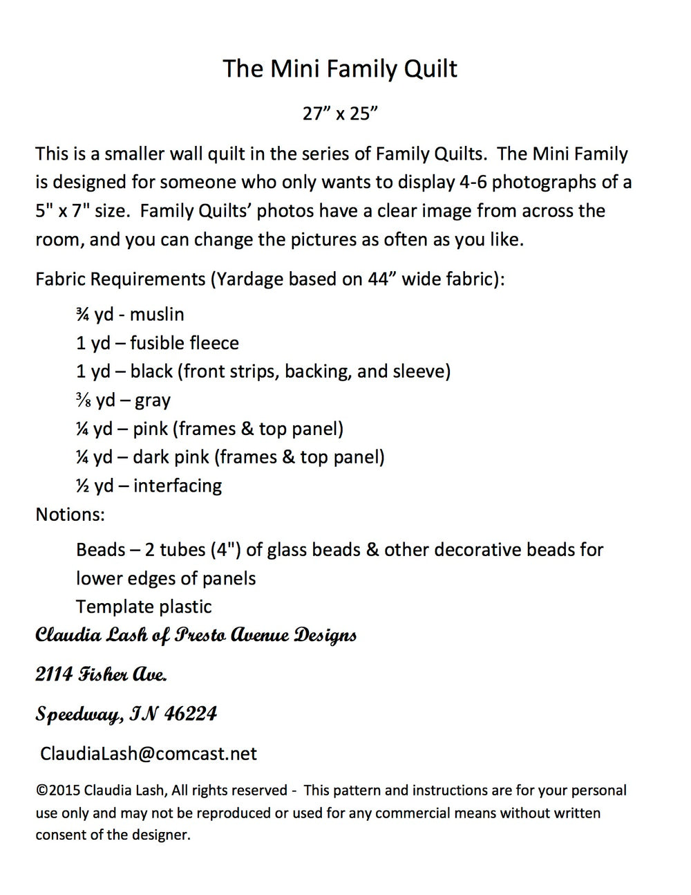 The Mini Family Quilt is an answer to requests for a smaller Family Quilt pattern. My original Family Quilt pattern makes a wall quilt which may be too large for some quilters, so I hope this mini version will work bet- ter. The main advantage of all the Family Quilts is the fact that the pictures are actual photographs rather than pho- tos transferred to fabric. This allows the photographs to have a much clearer image from across the room, and you can change the photos as often as you like. Skill level: Intermediate