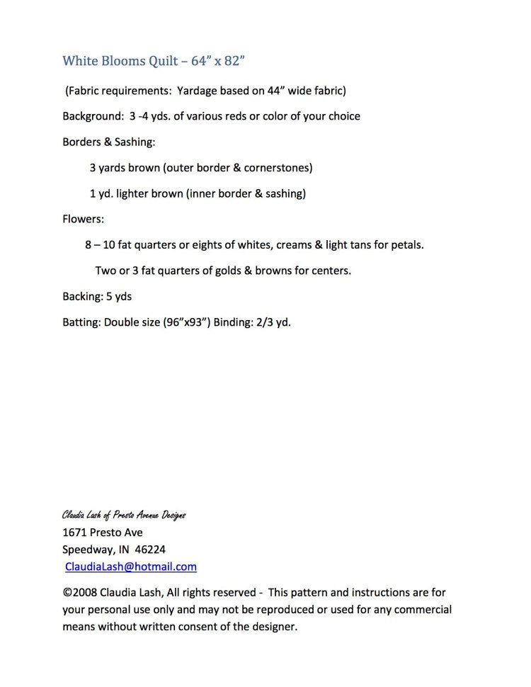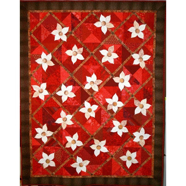 One day I looked at my fabric collection and decided that I had too much red fabric. So I thought I’d use up red scraps to make a background for a quilt. That’s how this quilt was born. It is a simple pieced background with white flowers appliquéd on top. You may choose to appliqué by hand or machine, and you may want to use another color for your background. If you’re like me, you may find you still have many reds when you finish, but you’ll also have a lovely quilt.