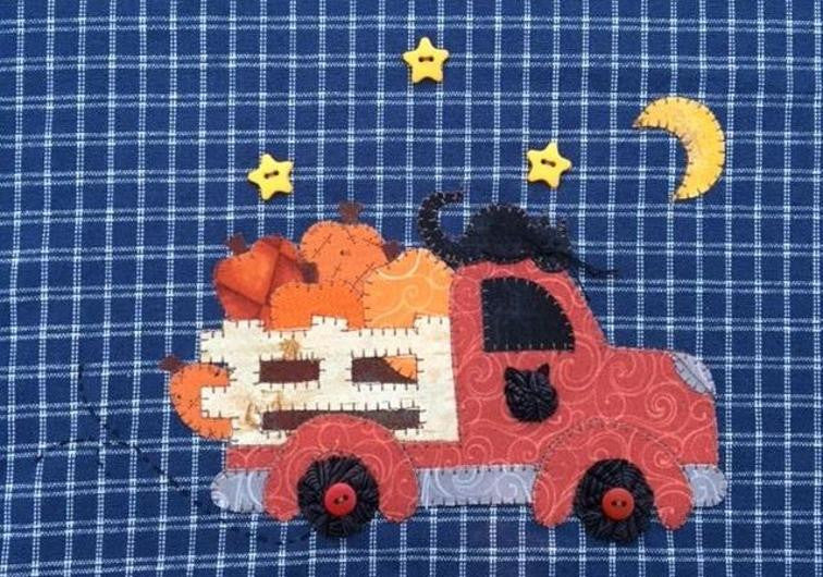 Fall Delivery is a cute design. Grandpa is bringing the pumpkins home to the farm... it's a special Fall-Halloween delivery, a bunch of Pumpkins! The moon and stars are our as he brings the pumpkins home for the trick or treaters to decorate. This applique design can be put on a tea towel like the directions instruct or used as a quilt square, appliqued pillow or any project that your imagination can think up. Let your imagination go! This adorable red truck would also be cute on a sweatshirt or on a placemat. It's a great project to be done using up some of your fabric stash and scraps. This design can also be done with wool. This adorable applique tea towel pattern will be a joy for both the beginner and experienced quilter and sewer. It's a quick and easy project that when finished would make a great gift!
