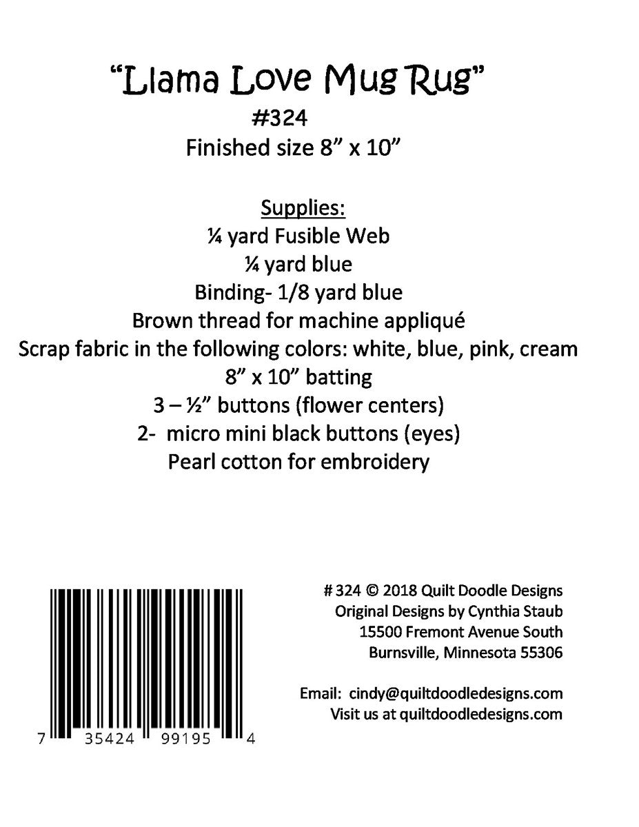 Llamas are in love this Valentine's day. This cute little llama design is so sweet on a mug rug. This is an adorable project to work on and a great way to use up scrap fabric while making an adorable mug rug. Make one or several to give to your family and friends. Pair it with some chocolate and you have a thoughtful Valentine gift for the sweeties in your life. This finished mug rug is also a cute accent to display on your table or use as a candle mat. Finished size is 8in x 10in