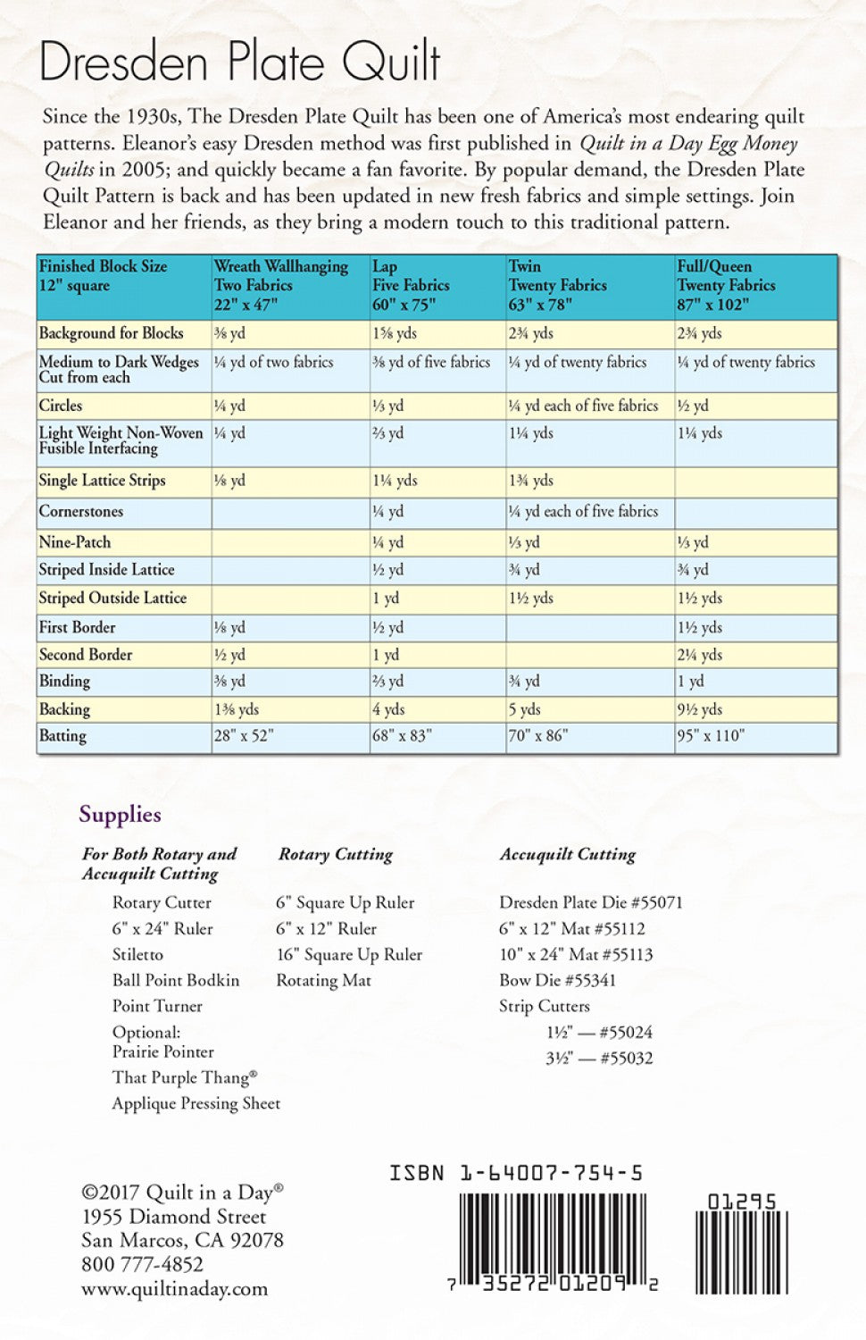 Since the 1930's, The Dresden Plate Quilt has been one of America's most endearing quilt patterns. Eleanor's easy Dresden method was first published in Quilt in a Day Egg Money Quilts in 2005; and quickly became a fan favorite. By popular demand, the Dresden Plate Quilt Pattern is back and has been updated in new fresh fabrics and simple settings. Join Eleanor and her friends, as they bring a modern touch to this traditional pattern.