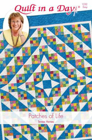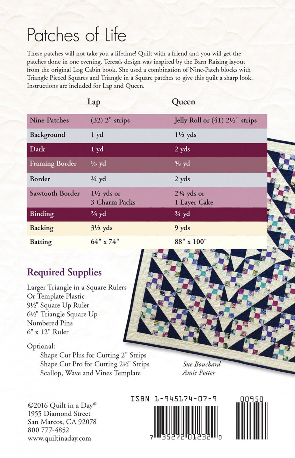 There are two sizes of blocks to choose from in Patches of Life. The Queen size quilt is made from 6in finished size blocks. The Nine-Patch uses 2-1/2in strips. Use a Jelly Roll or cut your own assortment of 2-1/2in strips. Triangle Pieced Squares and Triangle in a Square patches are made from 7in and 8in