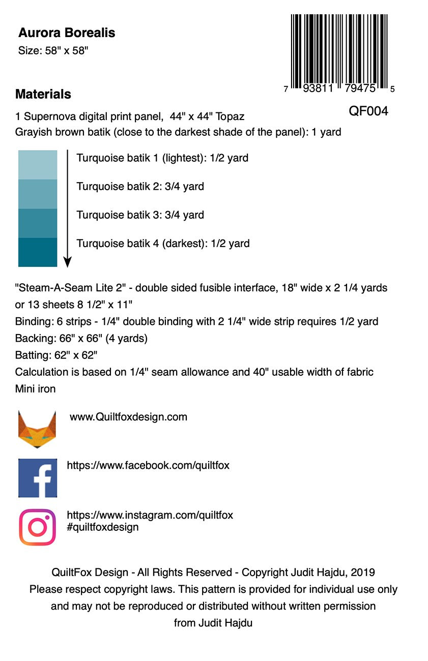 The Aurora Borealis is featuring the Hoffman Digital Print Supernova panel. The size of the quilt is 58" x 58" The pattern contains - actual size layout guide - template sheets to be copied on the paper side of the fusible interface, so you do not need to trace the templates - detailed and step by step instructions with color images to assemble the quilt Quilters familiar with basic machine appliqué techniques will easily be able to master this breathtaking quilt.