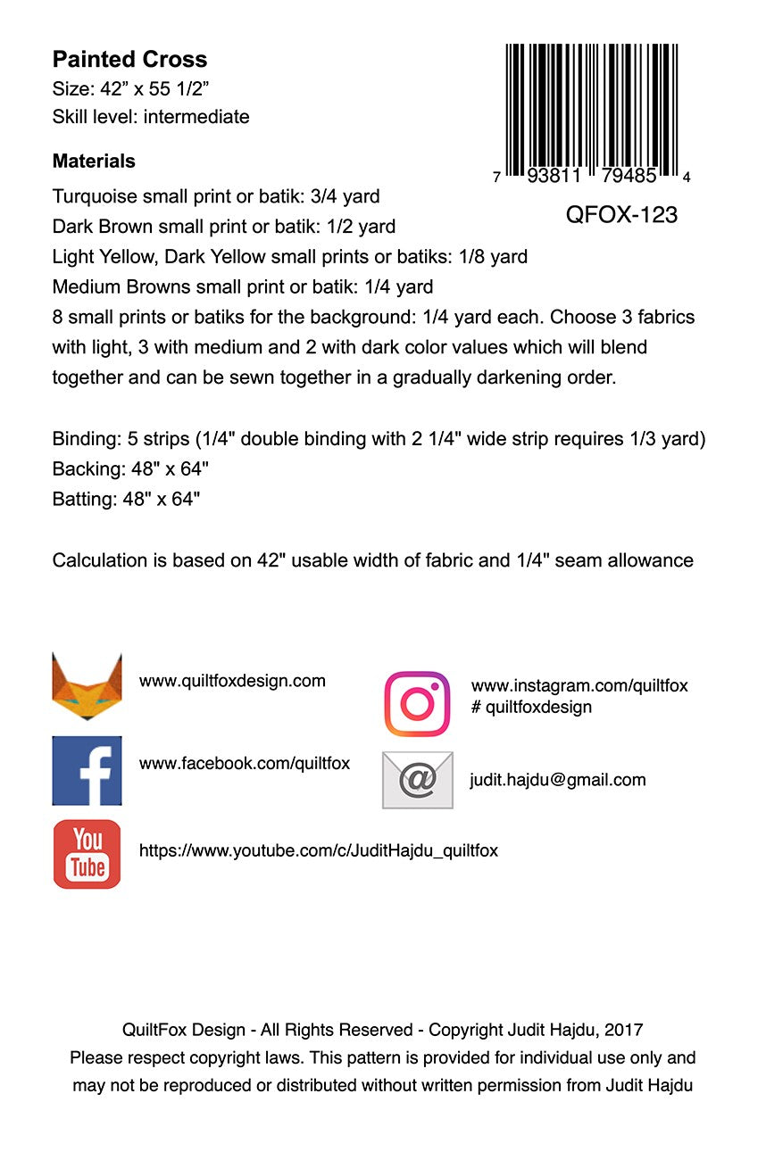 The Painted Cross was made of hand dyed batiks with water color piecing technique. The step by step instructions are illustrated with color images and easy to follow. The pattern contains the yardage calculation, cutting instructions, piecing from strips whenever it is possible and quilt assemble guide. Wall hanging size: 42in x 54in