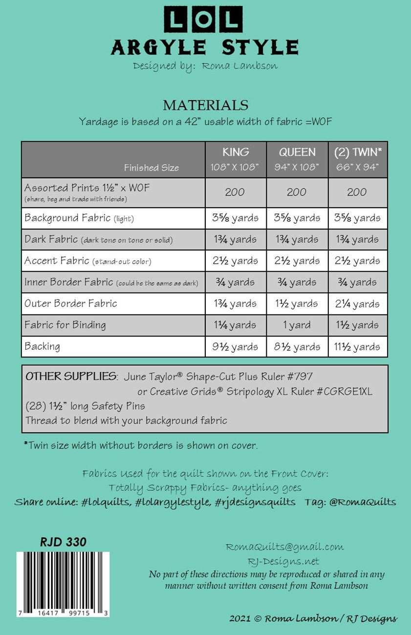 The sixteen page pattern booklet gives detailed instruction needed to construct bed-sized quilts using LOL (lots Of Little) one-inch squares.