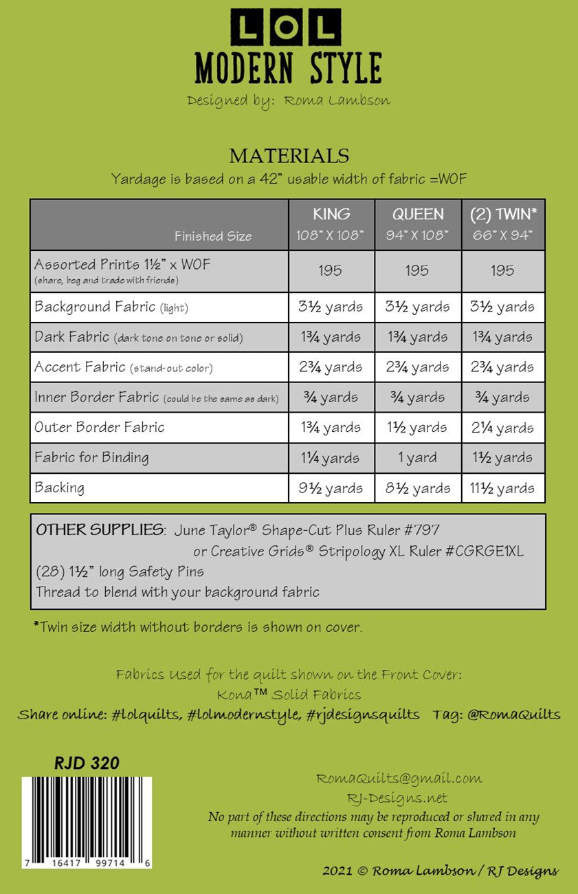 The sixteen page pattern booklet gives detailed instruction needed to construct bed-sized quilts using LOL (lots Of Little) one-inch squares.