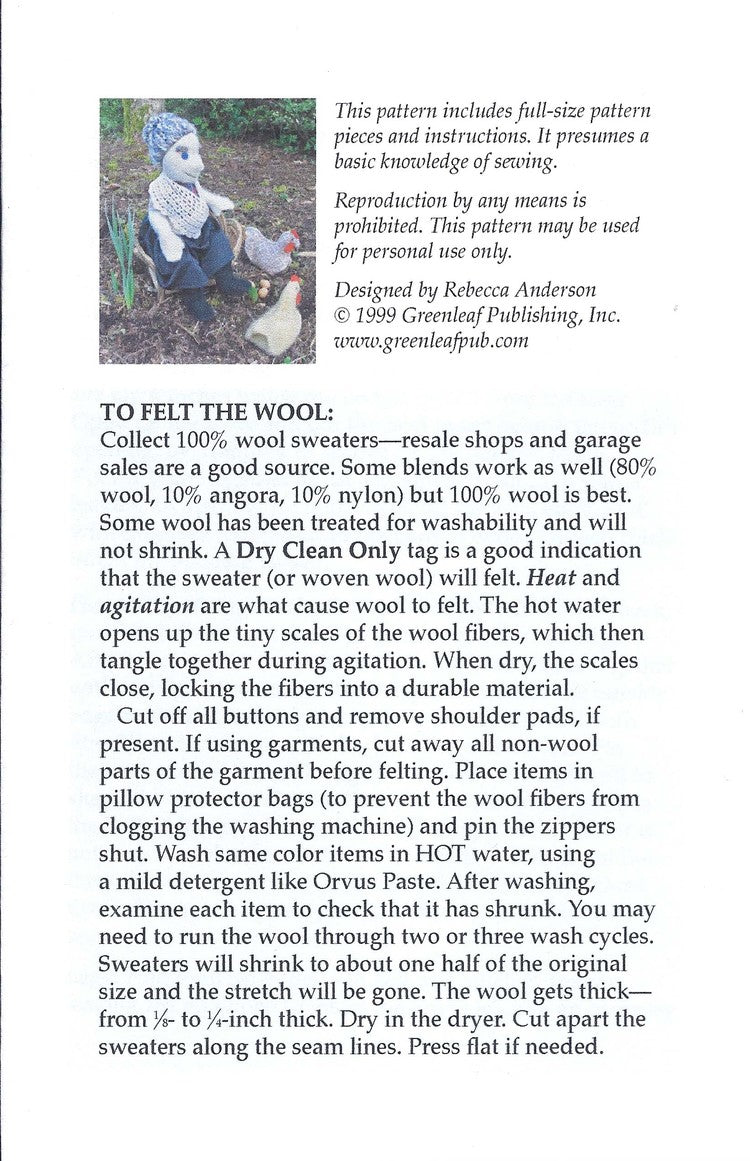 Make this delightful 15.5-in.-tall jointed doll (hens are 4-in. tall) from felted wool (shown), coat-weight wool, or heavyweight polar fleece.