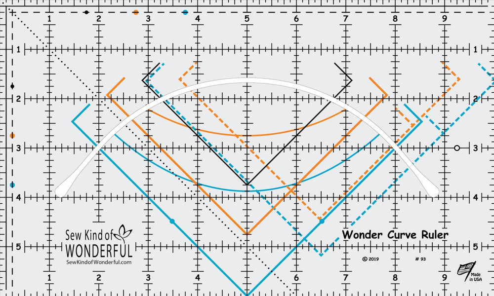 The Wonder Curve Ruler is a fun curved ruler with added colored reference lines for cutting and squaring up your blocks.