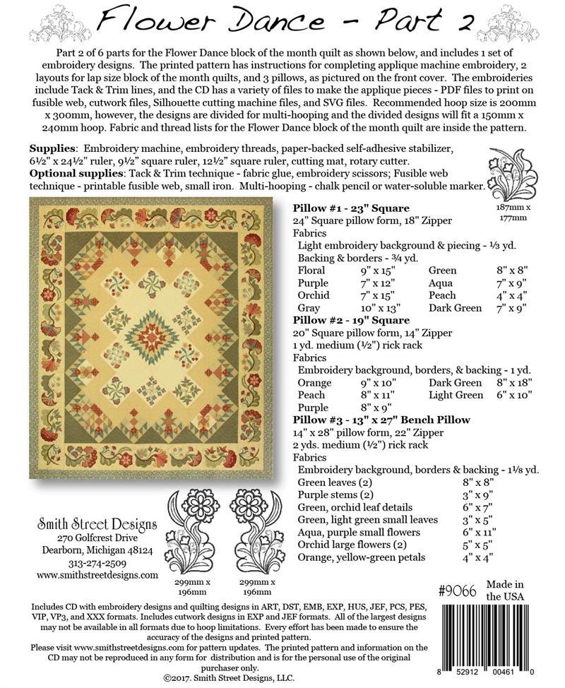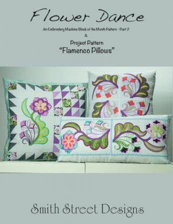 Flower Dance Block of the Month embroidery machine applique quilt pattern - Part 2. Also includes Flamenco Pillow project pattern. ART, DST, EXP, HUS, JEF, PCS, PES, VIP, VPS, XXX embroidery formats. Recommended hoop size 200mm x 300mm. Designs also divided for 150mm x 240mm hoops.