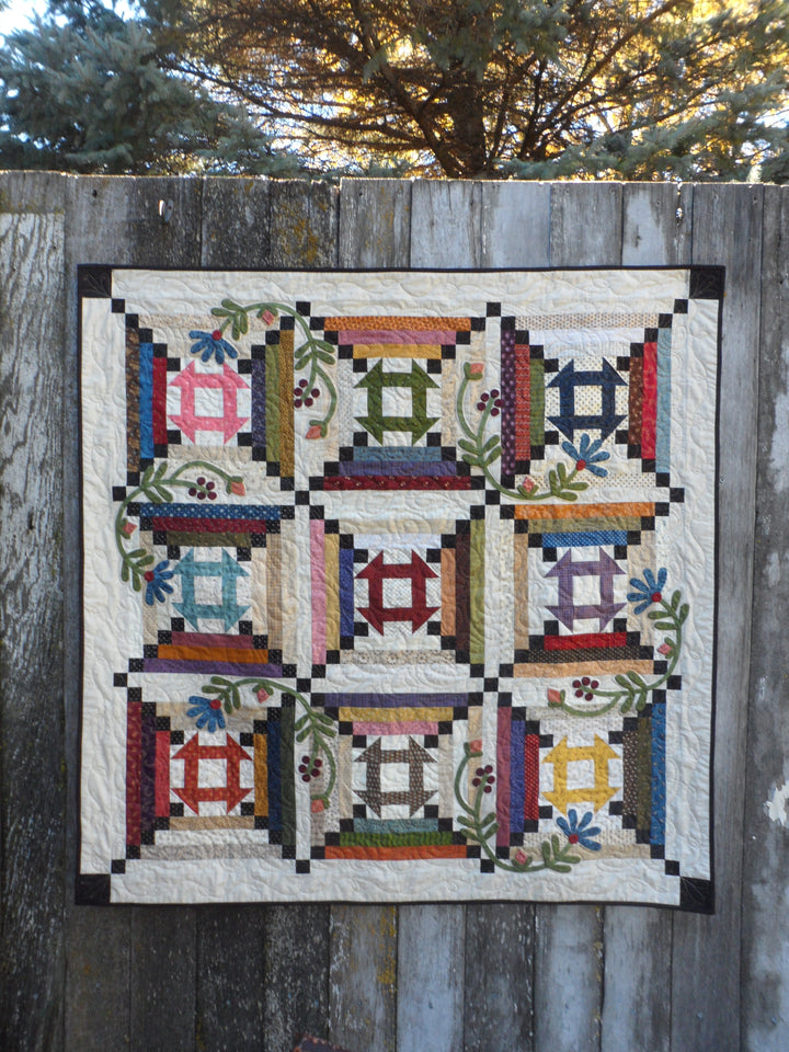 44 1/2 x 44 1/2" scrappy & appliqued wall hanging that can also be used as a table topper! Use your favorite color prints to create the stunning churn dash cabin blocks. Applique is needle-turn hand applique but you can do it by machine too!