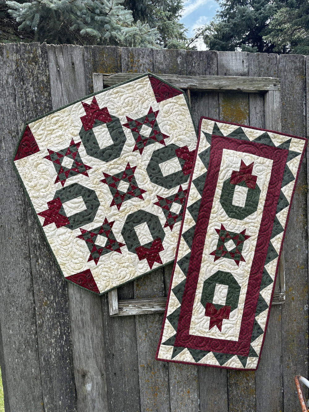 Two new projects, a table runner and a table topper, for your Christmas décor! Use your favorite red and green fabrics.