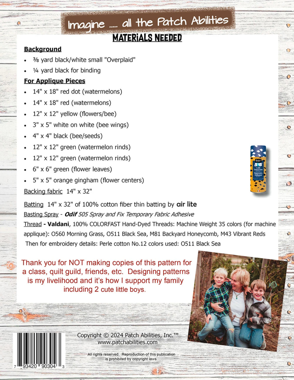 Big watermelon slices, a hungry honeybee and happy yellow daisies on the black and white Overplaid background.