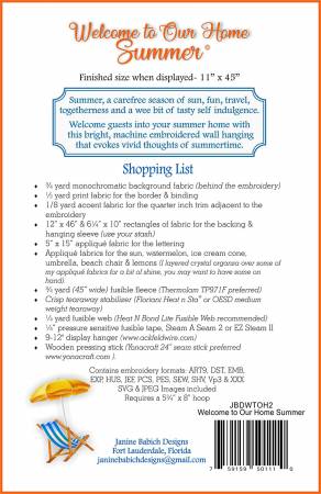 Summer, a carefree season of sun, fun, travel, togetherness and a wee bit of tasty self indulgence. Welcome guests into your summer home with this bright, machine embroidered wall hanging that evokes vivid thoughts of summertime. This pattern also includes a 'Welcome to My' home design for solo home owners.