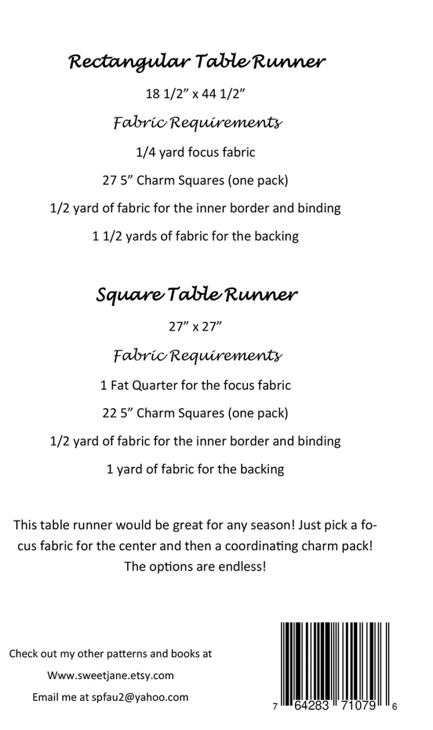 A square measuring 27" x 27" or a rectangular table runner measuring 18 1/2" x 44 1/2".