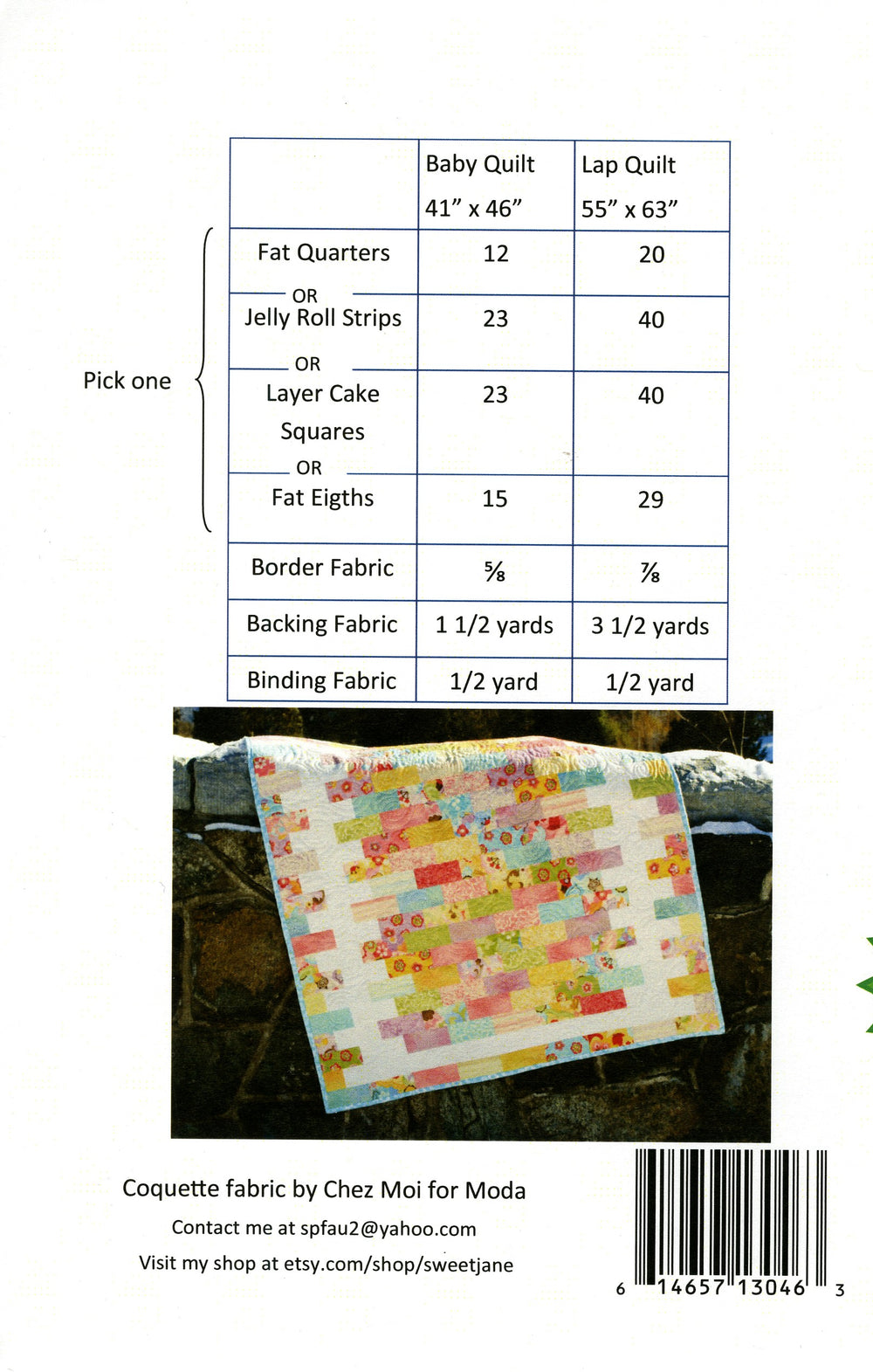This pattern is written for two sizes, baby and lap size. It is quick and easy. The baby size is perfect for Riley Blake precuts and many of the other designers that have 24 strips or layer cakes bundled together.