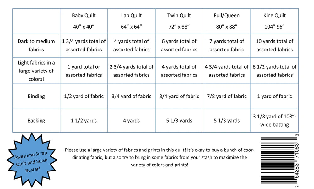This pattern is an excellent scrap quilt and stash buster. I would encourage buying a fat quarter bundle to get started, and then pulling in fabrics from your stash to maximize the variety of colors and prints.