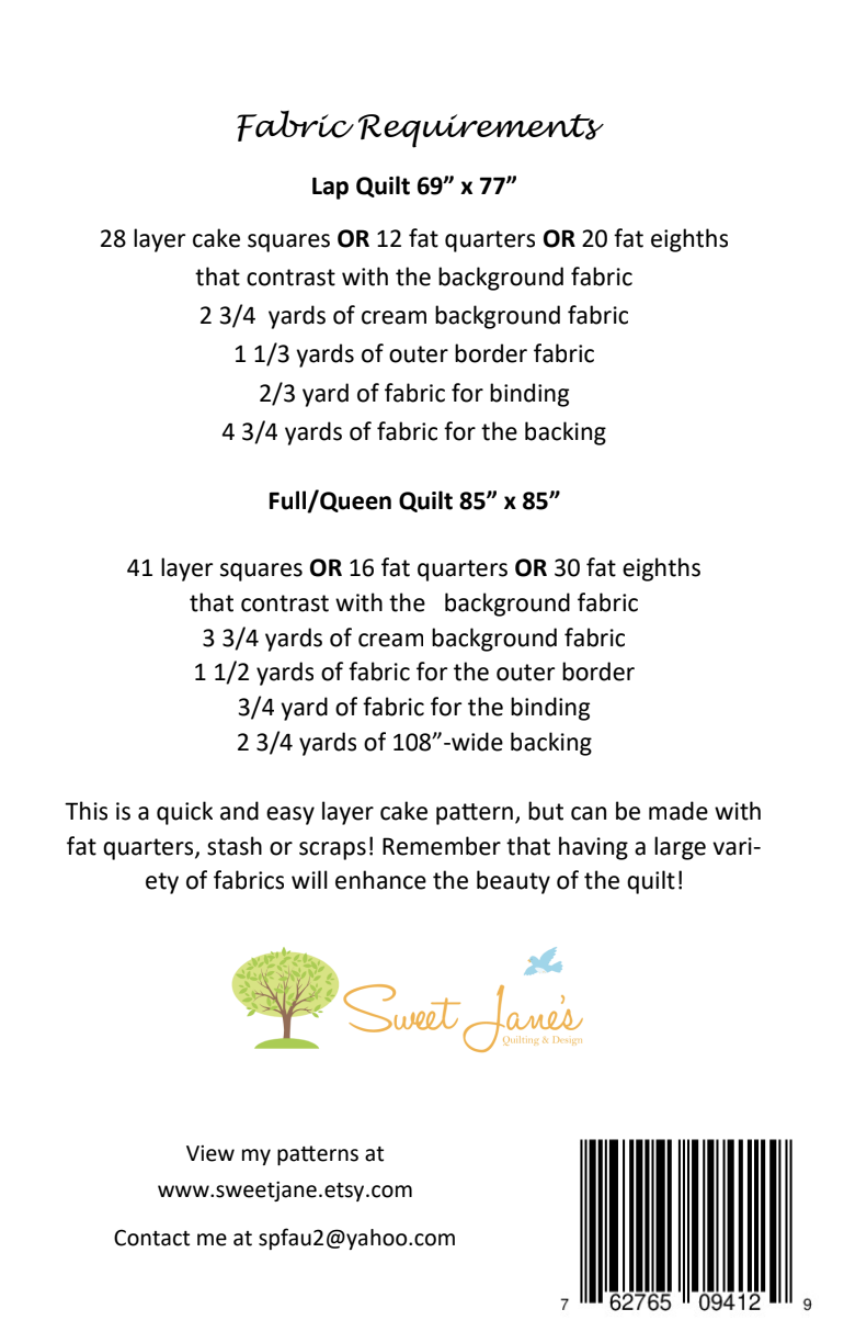 This pattern can be made with a layer cake bundle, fat quarters, fat eighths, stash or scraps! It goes together quickly and is an easy beginner friendly pattern