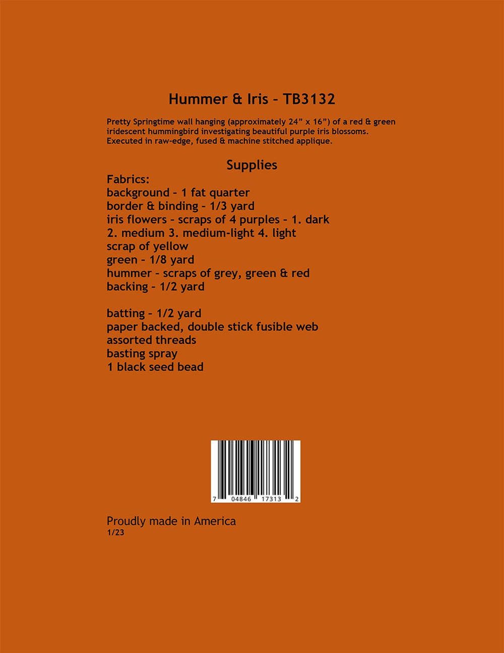Hummer & Iris Quilt Pattern is backordered and will ship as soon as it is back in stock.