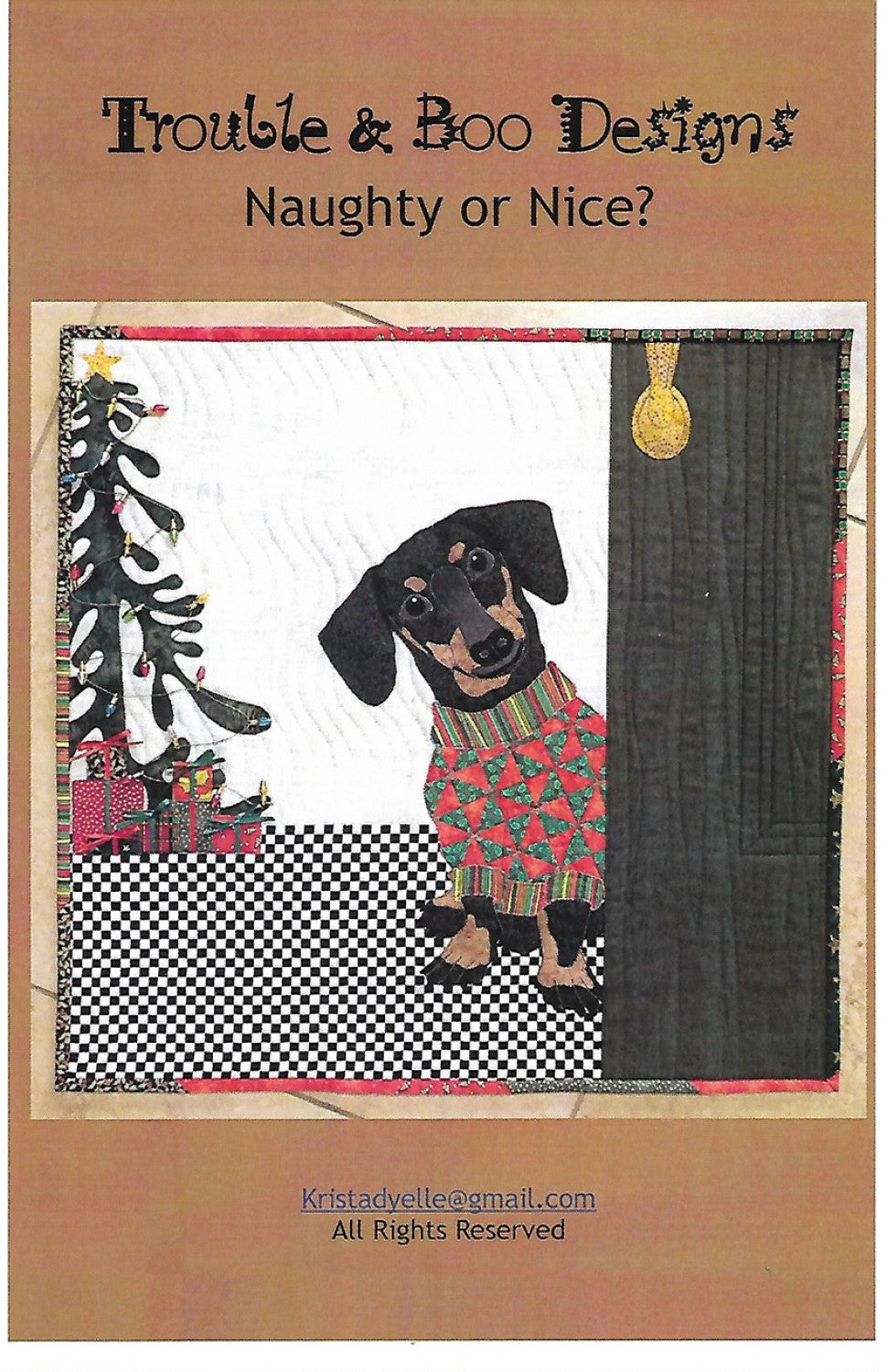 21 inch square wall hanging of a quizzical dachshund, happy to be in his Christmas sweater, welcoming you in for the holiday. The dog is raw-edge, fused applique. The sweater is pieced in half square triangles in a pinwheel pattern. Wacky applique Christmas tree in background is embellished with sewn-on Christmas lights. Gifts have ribbon bows. The binding is pieced from the Christmas fabrics used for the gifts.