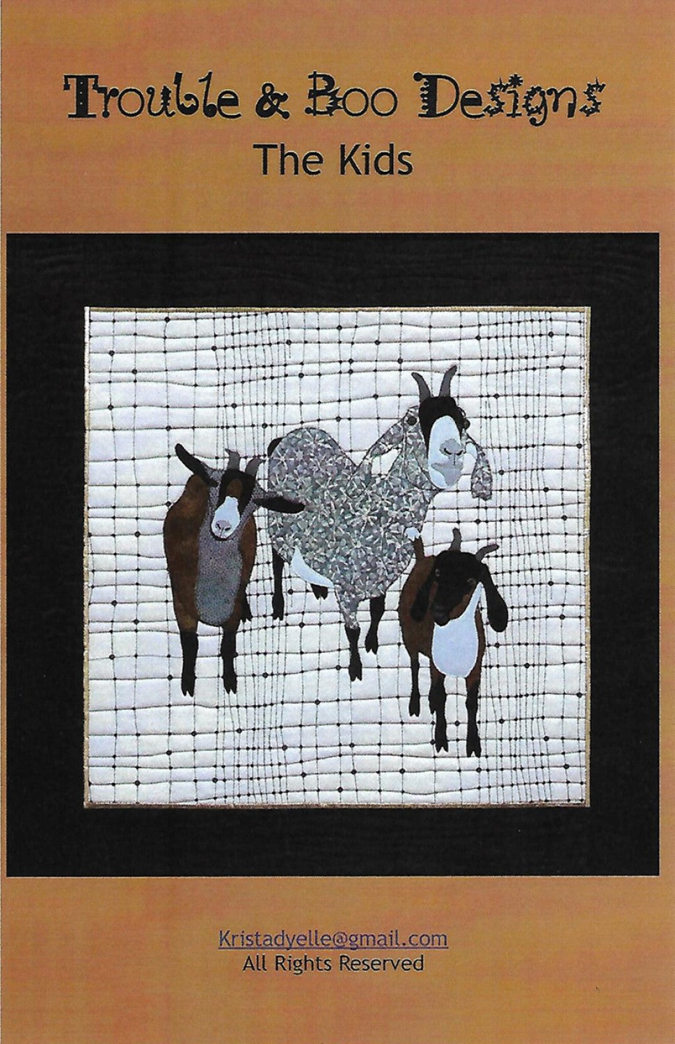 Wall hanging of 3 goats approximately 21 inches square. An elegant treatment of a barnyard theme. Raw-edge & fused applique bordered in gold lame & silk shantung.