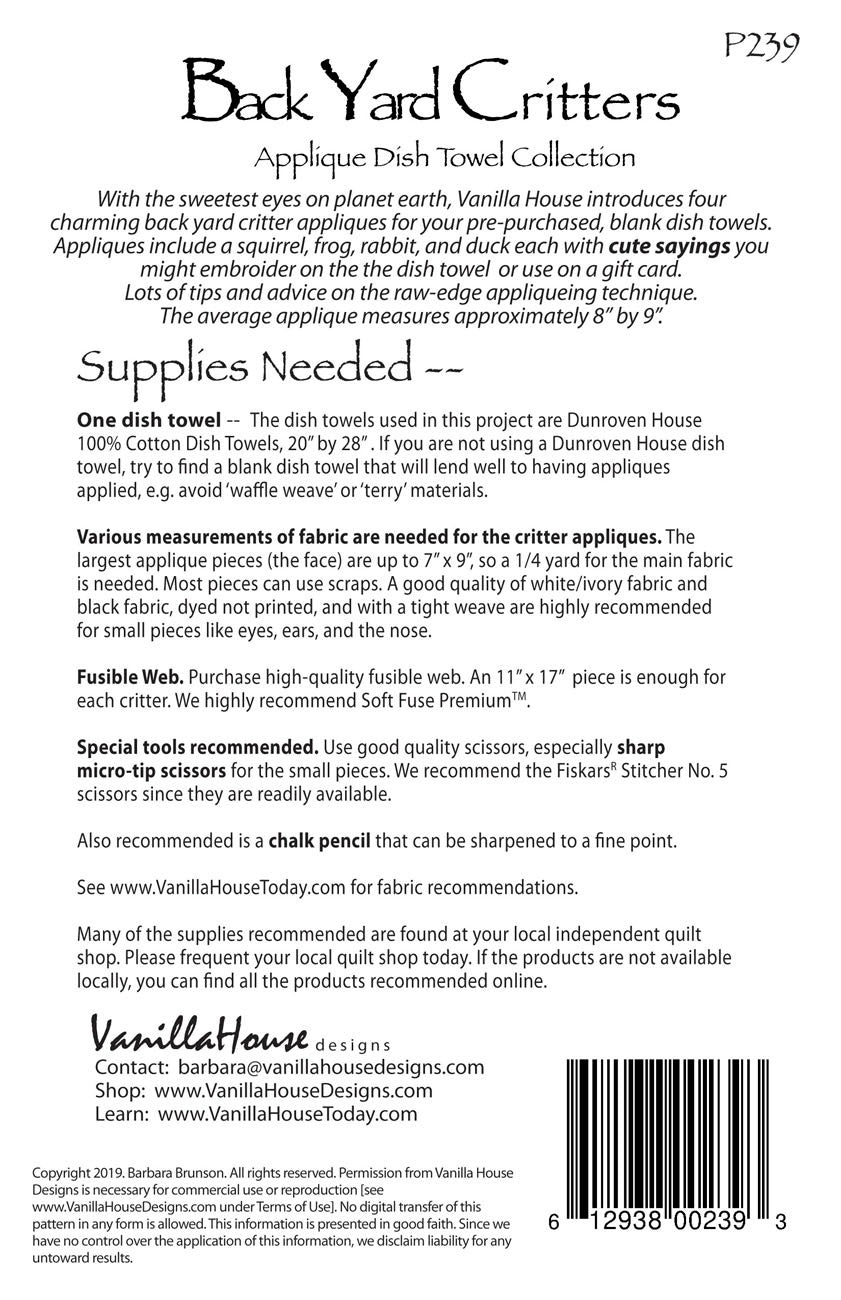 With the sweetest eyes on planet earth, Vanilla House introduces four charming back yard critter appliques for your pre-purchased, blank dish towels. Appliques include a squirrel, frog, rabbit, and duck each with cute sayings you might embroider on the dish towel or use on a gift card. Lots of tips and advice on the raw-edge applique technique. The average applique measures approximately 8” x 9”.
