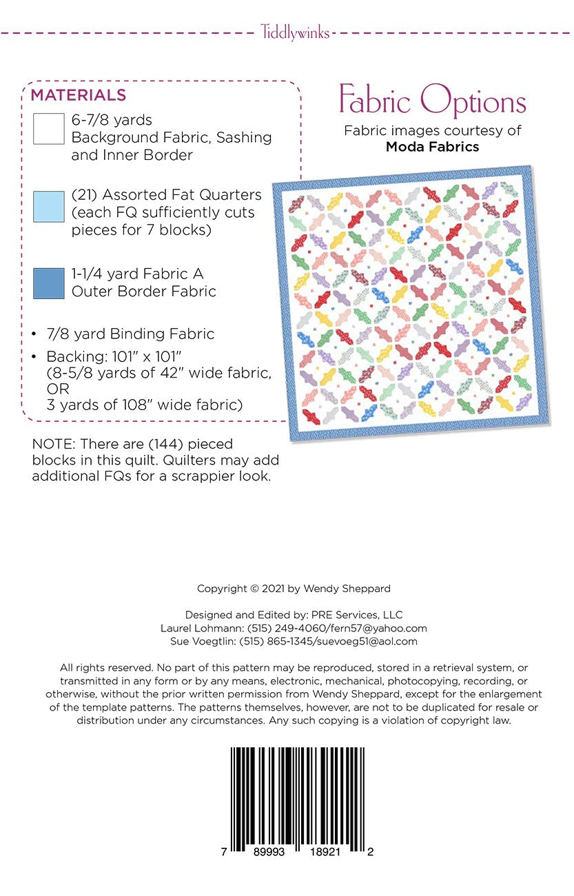 93in x 93in. A design that is not fabric-dependent and fat quarter friendly - works for any fabric combinations for different final looks. Conventional piecing.