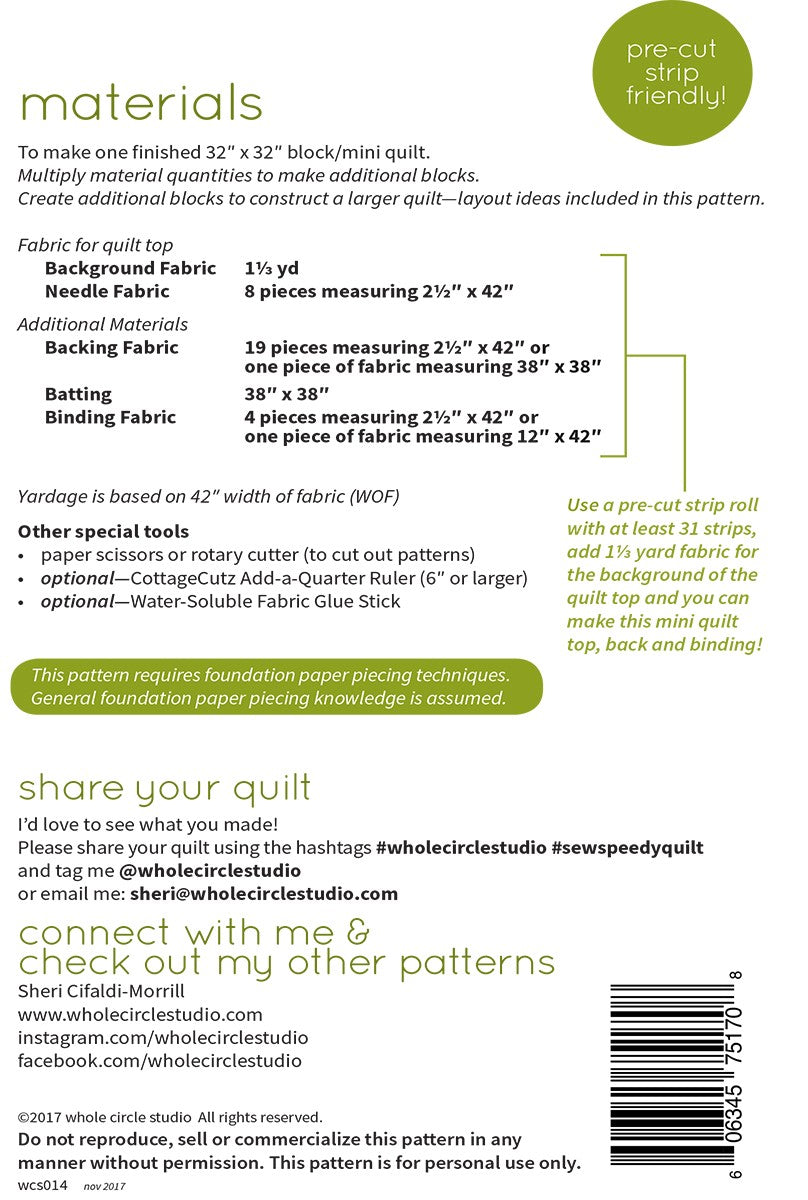 A great mini quilt to make as a wall hanging for your sewing space or gift to a sewist. Kit and pre-cut strip friendly! You can make this quilt top, back and binding with 1 pre-cut strip roll (containing at least 31 strips) and 1 1/3 yards of fabric. Pattern makes one 32in x 32in block. Make additional blocks to create a larger quilt (layout ideas are provided). Included in this pattern: Full color photo and diagrams. Detailed fabric requirements, tested instructions and diagrams, and lots of tips and tricks.