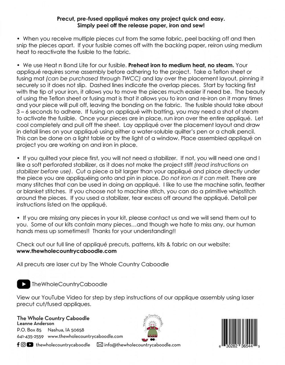 Includes precut fused applique and finished drawing for assembling applique