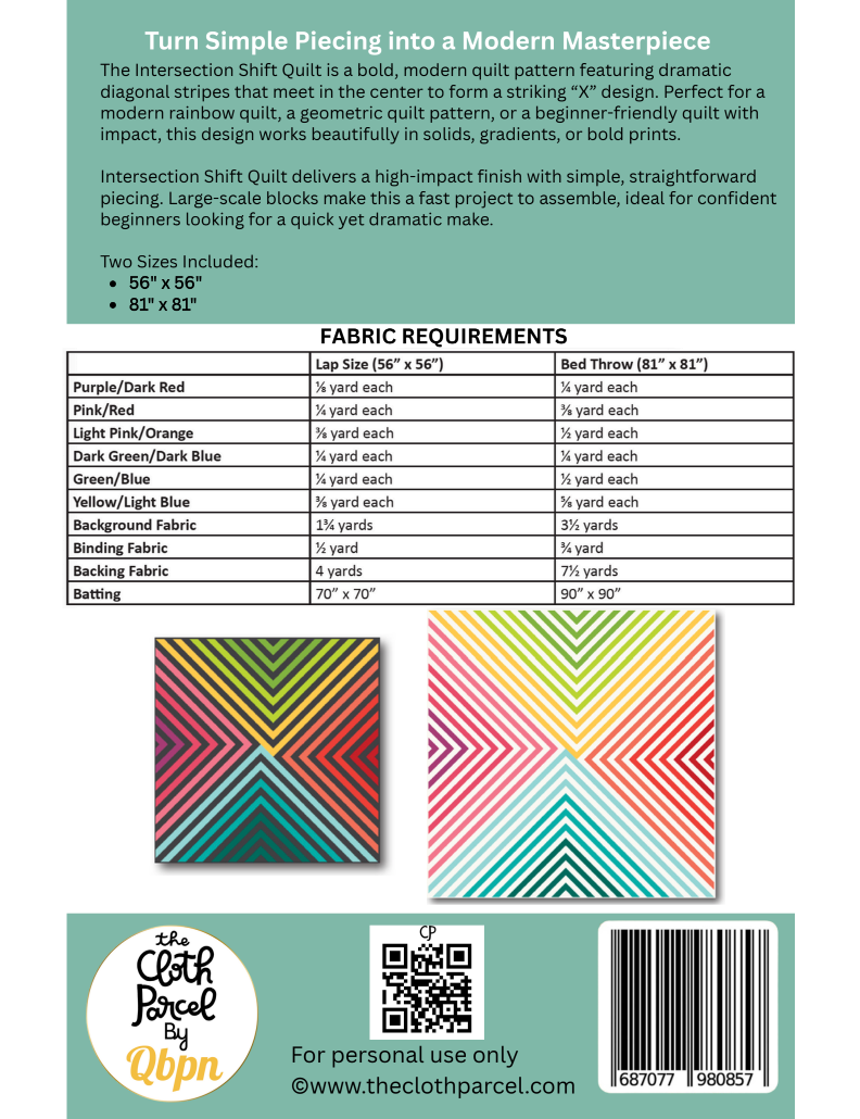 Intersection Shift is a gorgeous modern quilt that plays with color ranges and change of direction. Instructions include directions for two sizes, lap and bed throw.