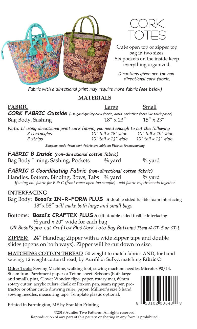 Cork Totes Pattern is backordered and will ship as soon as it is back in stock.