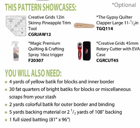The Creative Grids Skinny Pineapple Trim Tool (CGRJAW12) is required. Designed by Cut Loose Press. This pattern includes fabric requirements and instructions to create the quilt shown. Intermediate skill level.