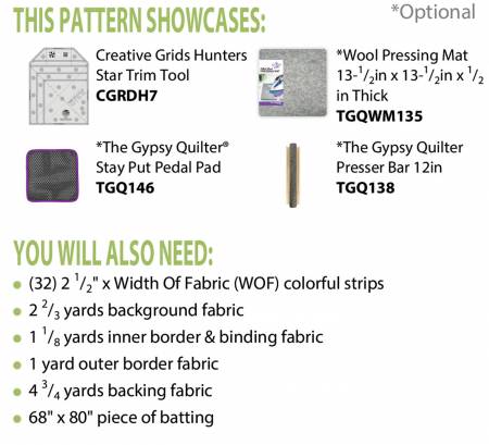 This colorful version of a Hunter’s Star is made with thirty-two, 2-1/2-inch strips or one package of strips. Or, bust your stash and cut your own or use up remnants of other packages. Whatever you decide, it is sure to be a stunning throw!