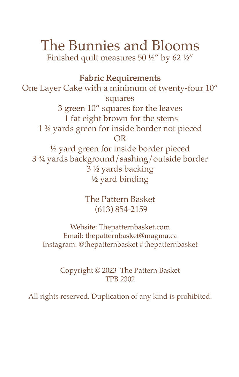 Bunnies and Blooms quilt finishes 50 1/2" by 62 1/2" - Layer Cake (10" square) friendly quilt pattern