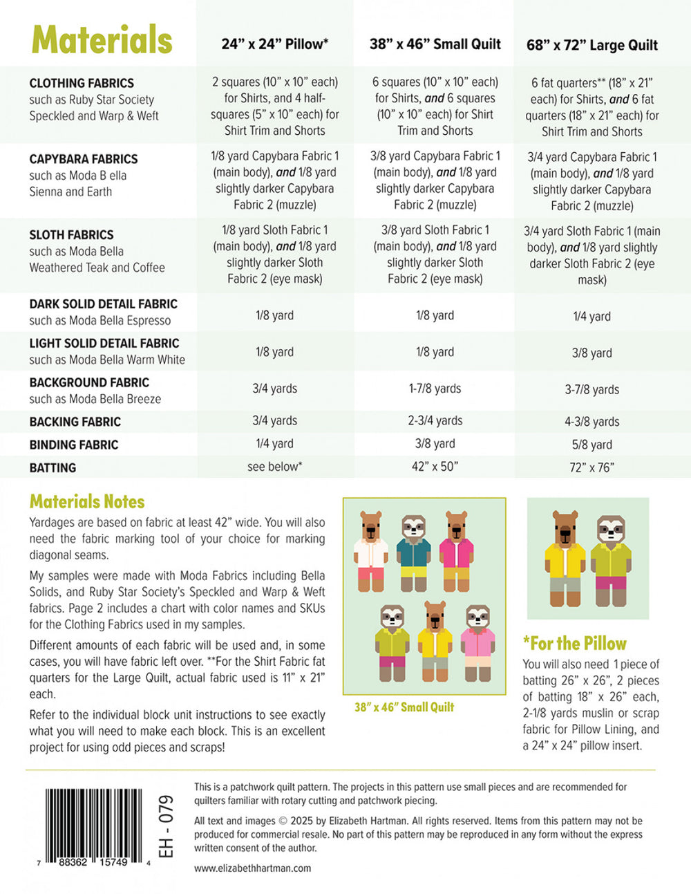 These capybaras and sloths are all dressed up in their vacation shirts and shorts. Make them using conventional patchwork techniques.