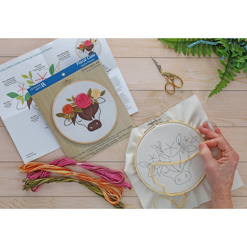 Includes 6" wooden embroidery hoop, embroidery floss, printed fabric, 2 embroidery needles and full-color, step-by-step instructions.