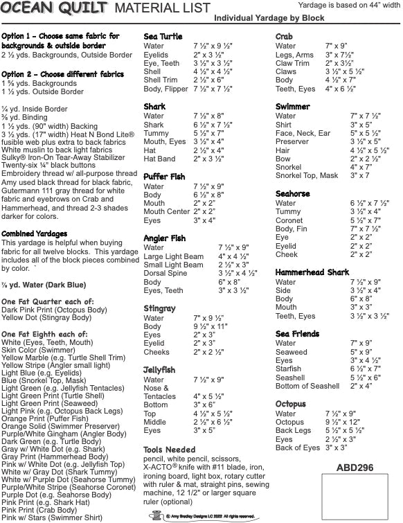 Ocean quilt pattern includes instructions with photos, full size patterns, and placement sheets to make this 42" x 54" quilt.  Patterns included for boy or girl version.  The block size is 12 1/2" x 12 1/2".  The technique is fusible applique.