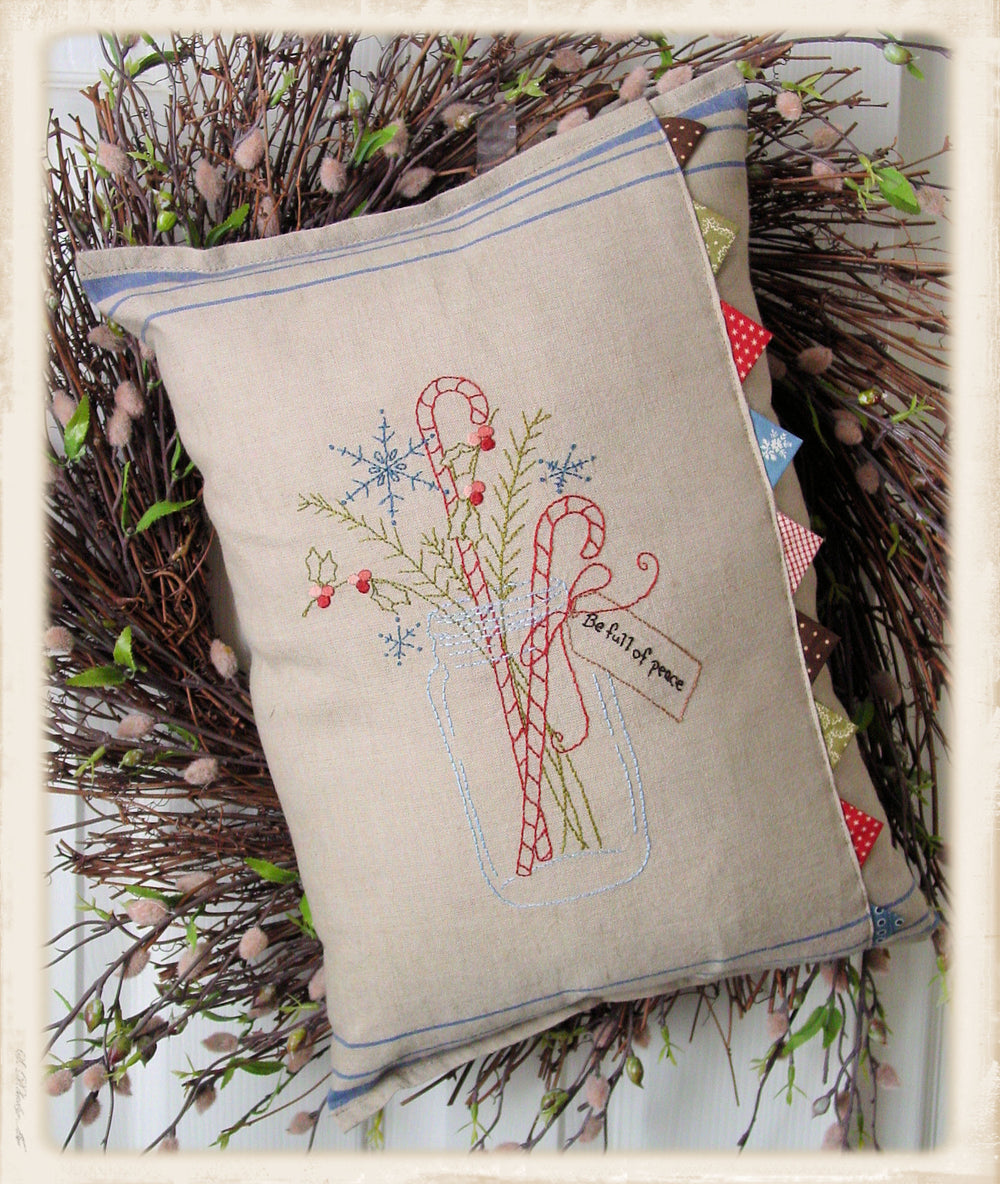 A sweet stitched 12in x 16in pillow. One in a series of four, this sweet pillow is stitched on toweling & uses simple embroidery stitches. Prairie points add delightful detail to this already charming project.