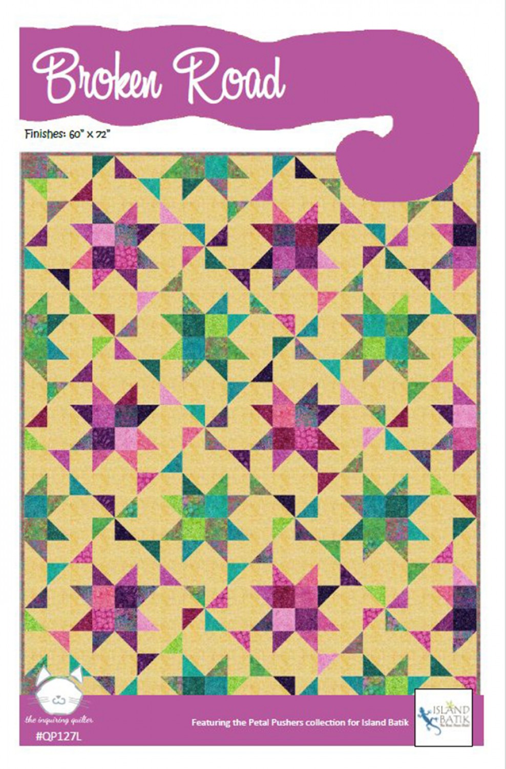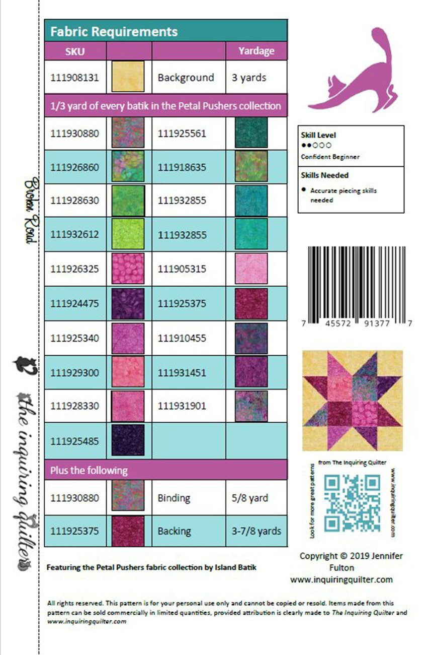Beautifully scrappy, Broken Road spins with color! Let Broken Road lead you home to a comfy quilt. The pattern is designed to use the Petal Pushers fabric collection by Island Batik although you can easily substitute your two favorite colors.