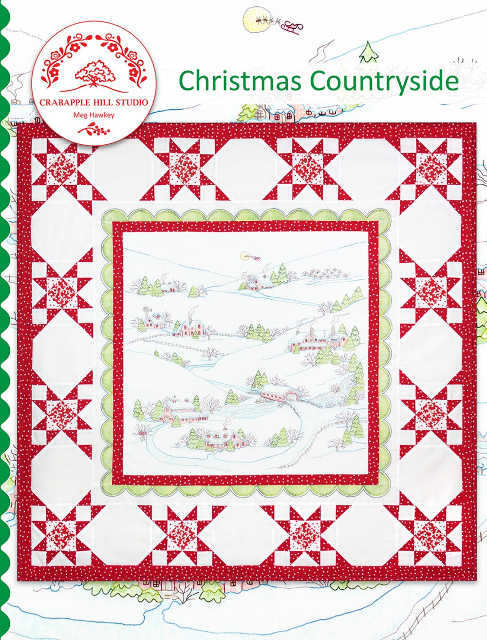 This design looks large and involved, but is actually a really easy stitch. Colored Pencil tinting highlights the village, and makes the cute faux appliqued scalloped border shine! The piecing is quick and easy also.