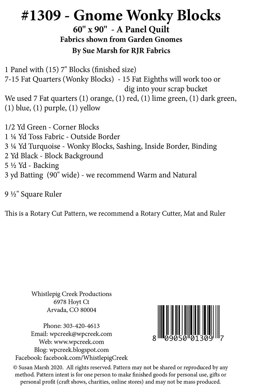 Use up your scrap bag with the fun wonky style quilt. We put "Garden Gnomes" by Sue Marsh for RJR to use for this 60" x 90" pieced quilt.